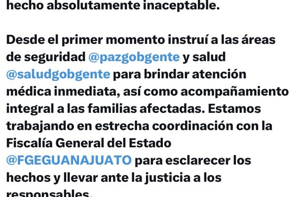 La gobernadora Libia Dennise García Muñoz Ledo condenó profundamente el ataque ocurrido la noche del martes en San Francisco del Rincón, donde niñas, niños y adolescentes resultaron heridos en un hecho absolutamente inaceptable. Desde el primer momento se activaron los protocolos de seguridad y salud para brindar atención médica inmediata y acompañamiento integral a las…