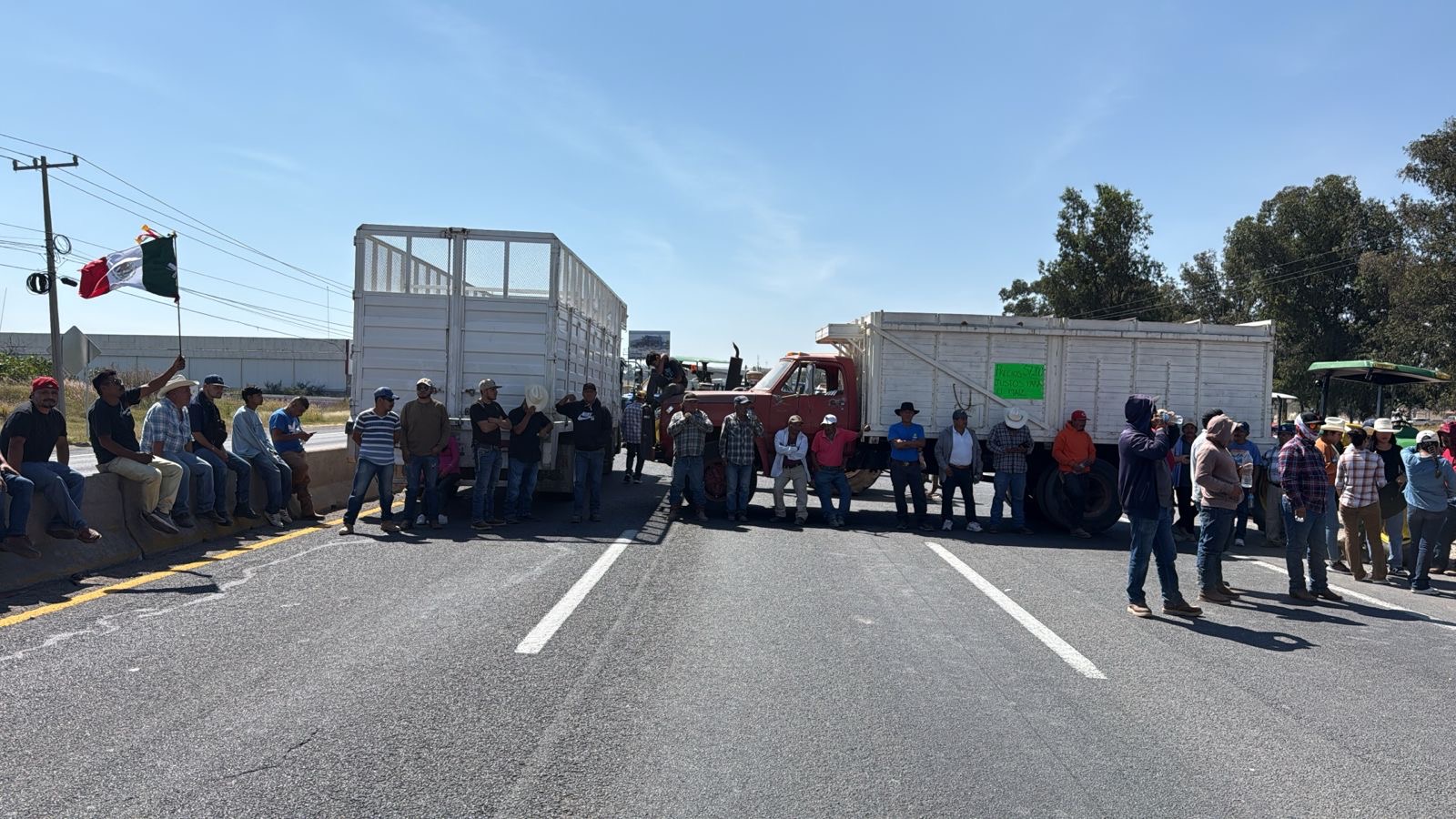 Tractocamiones y vehículos de carga fueron colocados sobre los tres carriles, mientras los manifestantes ondean banderas de México.