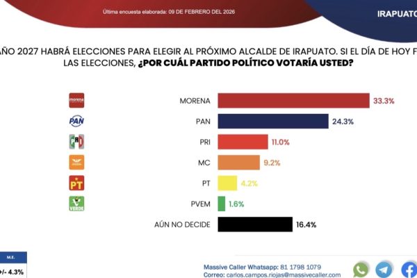 Una encuesta difundida por la casa encuestadora Massive Caller revela que, si hoy se celebraran las elecciones en el municipio de Irapuato, el partido Morena obtendría la victoria con el 33.3% de la intención de voto. En segundo lugar se posiciona el Partido Acción Nacional (PAN), seguido por el Partido Revolucionario Institucional (PRI), Movimiento Ciudadano…