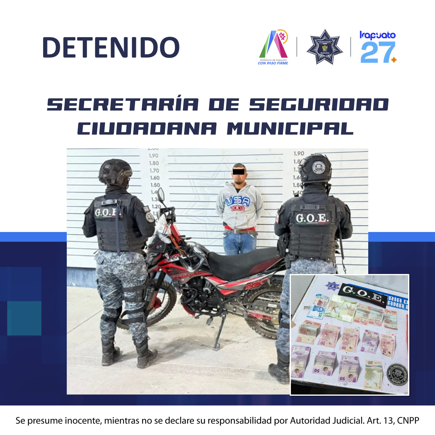 Irapuato, Gto., a 20 de abril de 2026.- Derivado de la atención oportuna a reportes ciudadanos y del seguimiento a delitos patrimoniales, integrantes de la Policía Municipal de Irapuato detuvieron a Jonathan “N.”, de 34 años de edad, señalado por su probable responsabilidad en el robo a una tienda de conveniencia ubicada en la colonia Che Guevara.